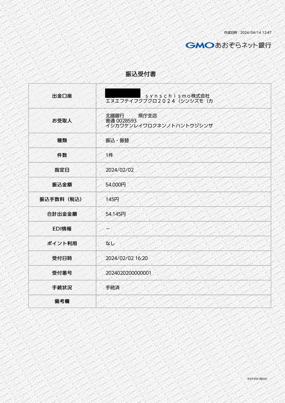 本年のNFT福袋の売上高18万円に対し、宣言しておりました30%に相当する54000円を、石川県ホームページ「令和6年(2024年)能登半島地震に係る災害義援金の受付について」にて公式に指定された銀行口座宛に振り込みをいたしました。残りの126000円については、関わっていただいた13名のアーティスト/クリエイターの皆様と弊社へ均等配分にてお支払いいたしました。