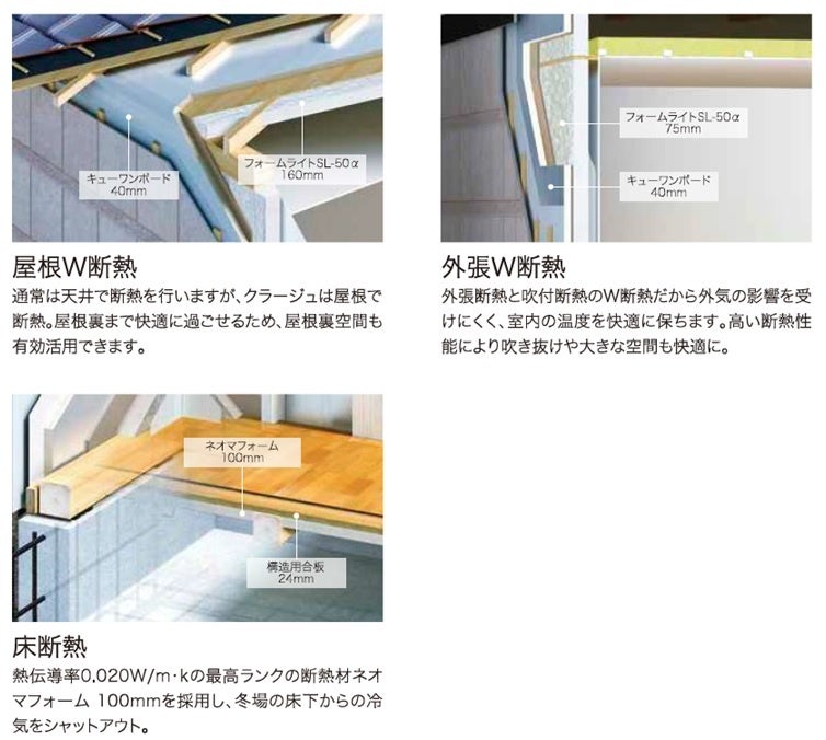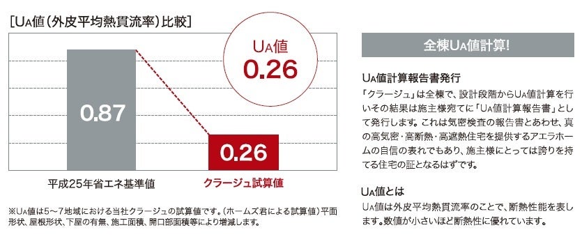 新「クラージュ」は、完全自由設計であることや、「外張W断熱」工法による高気密・高断熱・高遮熱性能などこれまでの良さはそのままに、より断熱性能を強化いたしました。特に屋根部分の吹付断熱材の厚さは従来の約3倍に、床の断熱材の厚さも従来の約2.5倍にすることでUa値0.26を実現し、冷暖房費が46%削減できる最高断熱仕様の「断熱等級7」(※1)を実現する商品となっております。また、全棟での気密検査、Ua値計算も実施することで、品質の確保を行っております。更に耐久性、耐候性の高い外装仕様の採用により建物の長寿命化、メンテナンスコストの抑制も実現します。