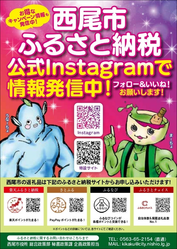 そのような中、当市では昨年10月「西尾市版ふるさと納税3.0」と銘打ち、新たな戦略的な取組として、「西尾市ふるさと納税」の露出を増やし、さらには「西尾市ふるさと納税」のファンを増やすことを計画し、直接的なPR手段を確立するためにインスタグラムの公式アカウントを開設しました。