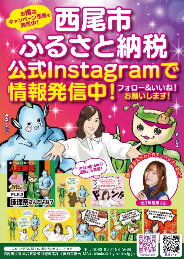 また、AKB48やSKE48で活躍された松井珠理奈さんには、「鰻♥抹茶大好きPRアンバサダー」に就任していただき、当市の特産品の鰻や抹茶をPRするため、松井珠理奈さんと当アカウントで共同投稿をすることで西尾市ふるさと納税を盛り上げてきました。