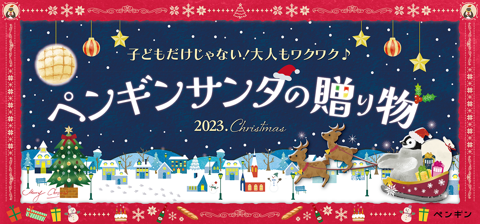 大人になっても心躍るクリスマス。今年のクリスマスはどんな風に過ごしますか?ペンギンベーカリーでは、ペンギンサンタからのおいしい贈り物をご用意しました。雪だるまやツリーの形をしたかわいいパンや、あったかビーフシチューパンなど、クリスマス気分を盛り上げてくれるパンをラインナップ。今年一年、良い子にしていたお子さんも、頑張った大人も。ペンギンサンタからの贈り物で、おいしいクリスマスをお過ごしください。