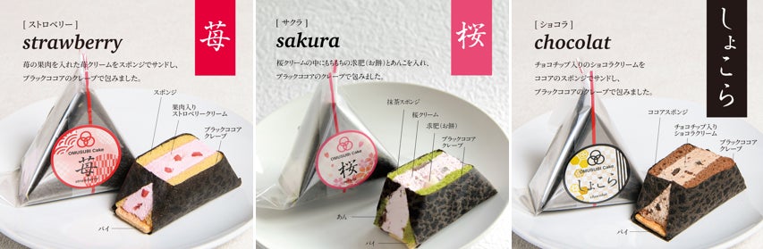 大阪発祥。見た目はおむすびなのに中身はケーキ!ブラックココアのクレープを海苔に見立て、各フレーバーのクリームをスポンジでサンドしたおむすび型のケーキです。コンビニのおにぎりのようにフィルムを取ってワンハンドでお手軽に楽しんでいただけます。味は定番の9種類に季節限定商品1種類を合わせた全10種類。半解凍の状態でもアイスのようにひんやりスイーツとしても楽しめます。新感覚のコミュニケーションスイーツとして多くの方の笑顔をお届けしていきます。