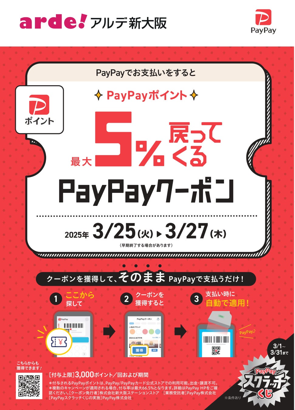 期間中に【PayPayアプリ】内で専用クーポンを取得してから、アルデ新大阪の対象店舗※にてPayPayでお支払いいただくと、最大5%(上限3,000ポイント/回および期間)のPayPayポイントが戻ってきます。