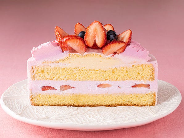 スポンジに苺とフランボワーズを合わせたベリーソースを乗せ、シャンティクリームでサンドし、グレナデンシロップで色づけしたクリームと苺でデコレーションしました。