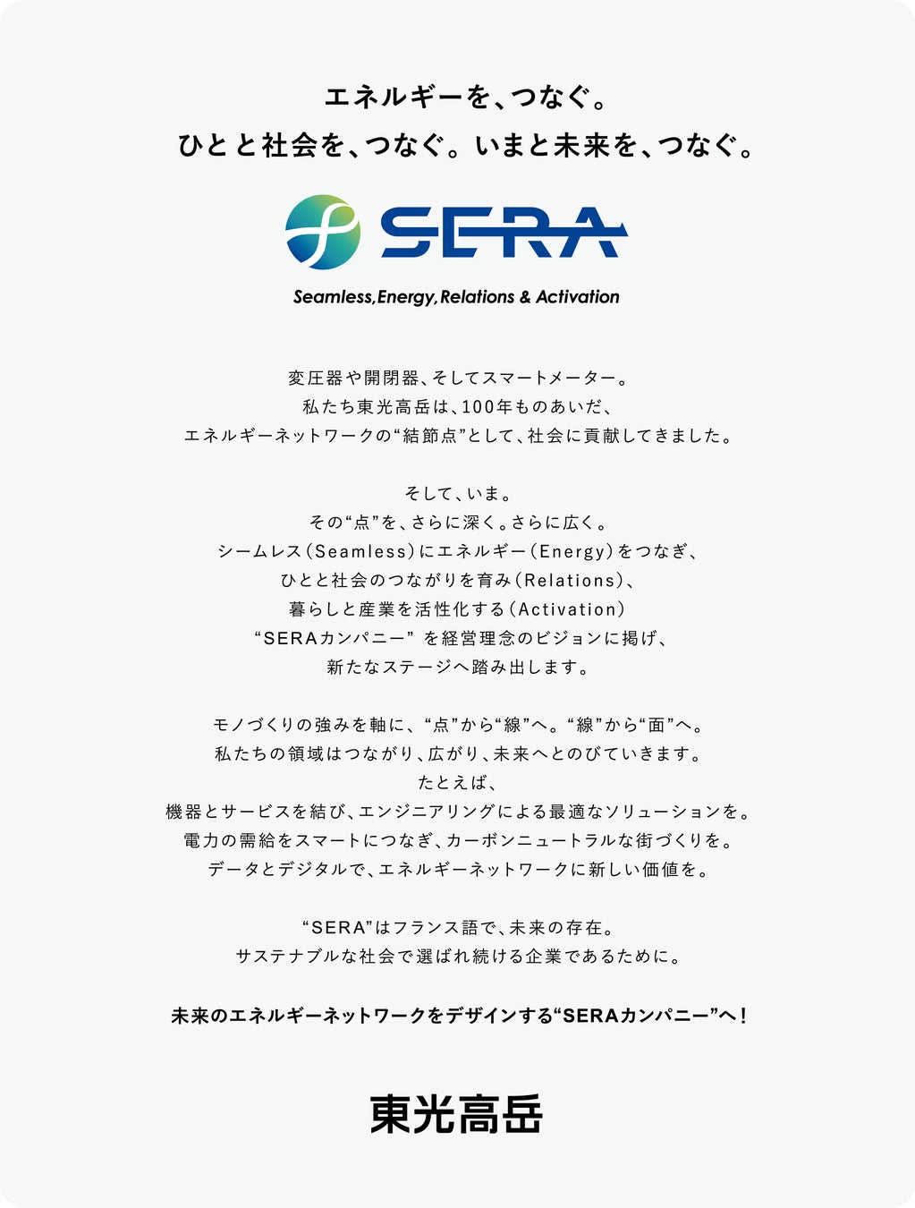 「SQCファースト」改革を通して培った高い安全・品質・生産性を製品競争力に転換しつつ、事業や組織の枠を越えて価値をつなぎ、エネルギーを起点に人と社会の未来をひらいていく――その進化の方向性を “SERAカンパニー” に表現しています。