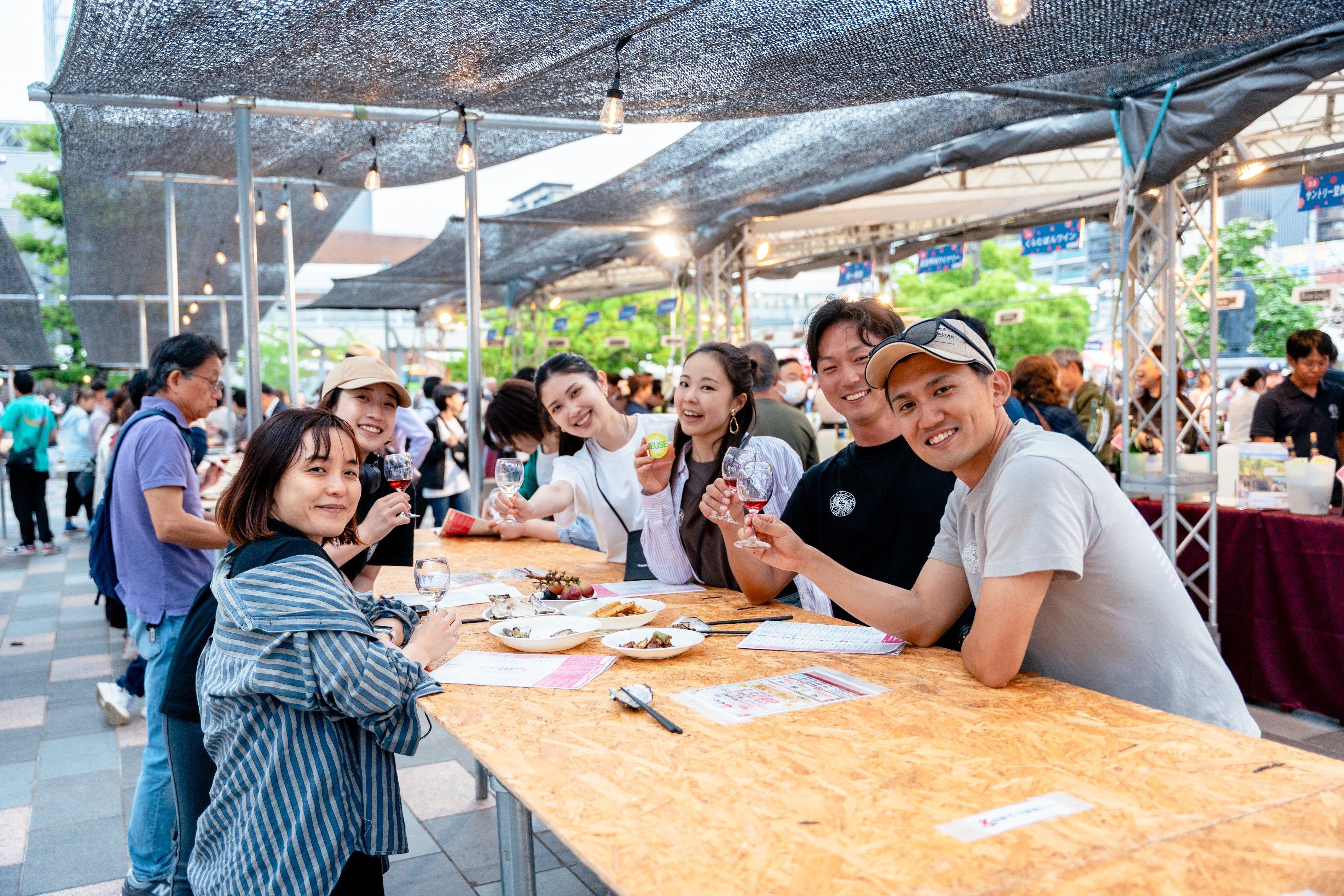 5月22日~24日、山梨・甲府駅前に出現します。青空の下、グラスで少しずつ。またグループでボトルをシェアしながら、山梨のワインと食を楽しむ空間です。
