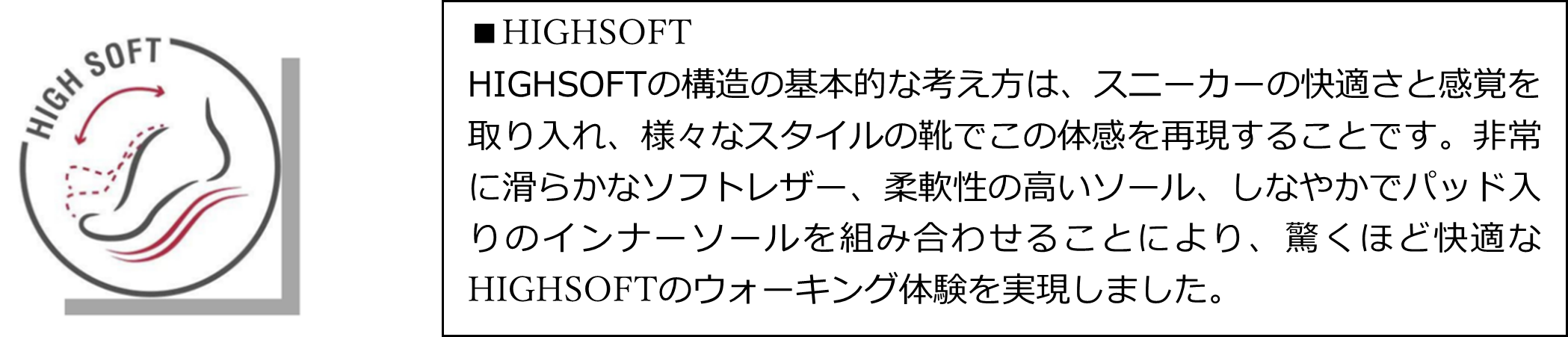 High Soft テクノロジーの特徴である柔らかなレザーと柔軟なアウトソールの組み合わせで心地の良いフィット感を得られます。