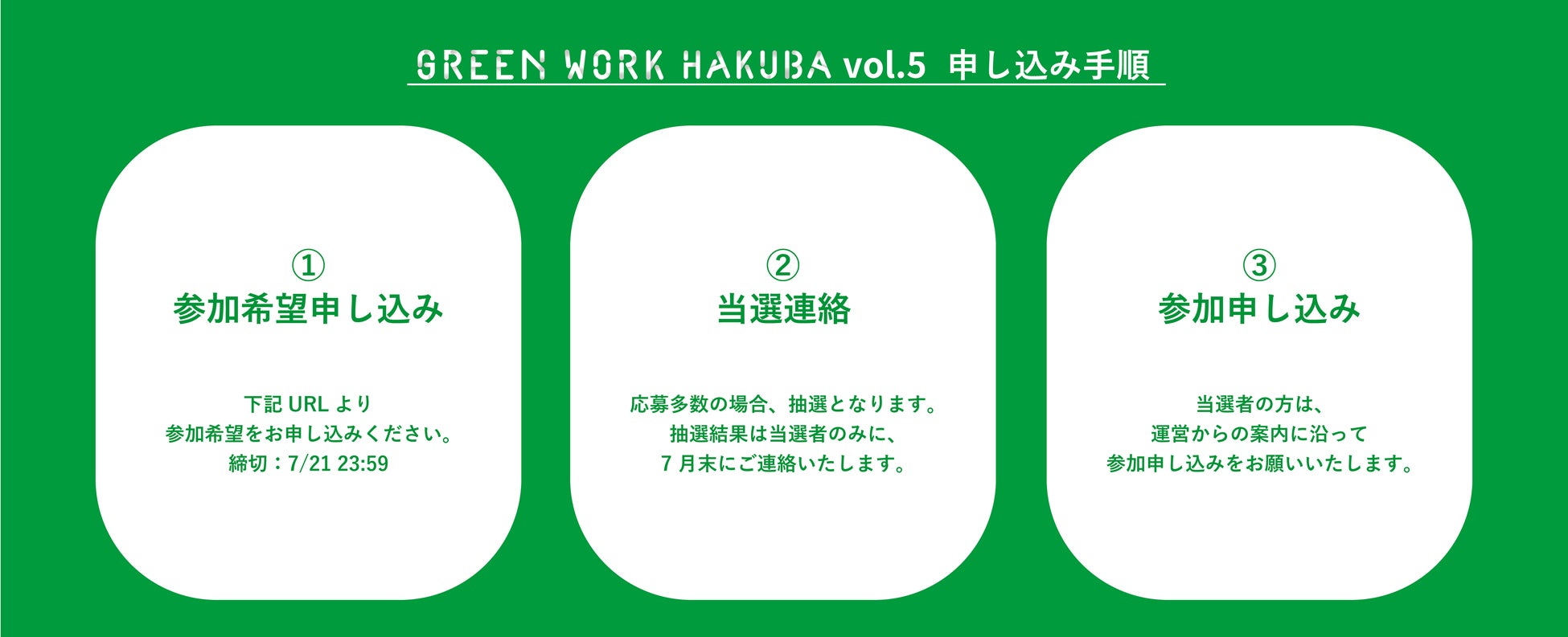 このたび、第5弾となる「GREEN WORK HAKUBA vol.5」(2023/9/6-9/8) の開催が決定しました。5回目となる今回は、「あたらしい出会い。おもしろい未来。」をコンセプトに、「参加者同士の交流」と「白馬での実証」に重きを置いたプログラムを実施します。