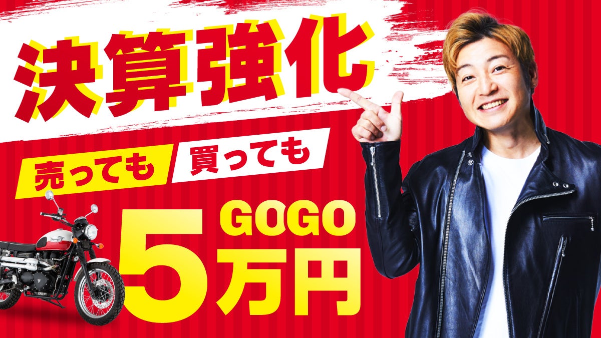 日頃のご愛顧に感謝を込めて、バイク王よりライダーの皆さまに向けた特別キャンペーン「“決算強化” 売っても買ってもGOGO!5万円」を実施いたします。昨年実施の決算キャンペーンから、今年は内容がさらにボリュームアップし、ご売却も、ご購入も、買い替えも今なら“5万円”お得な4つのサポートをご用意しました。買い替えや免許取得応援として、バイク購入費用5万円サポートや、バイクをご購入で選べるオプション5万円分、車両ご売却で、毎日5万円が誰かに当たる企画など内容は盛りだくさんです(全て126cc以上が対象)。売っても買っても5万円お得な34日間をこの機会にお見逃しなく!