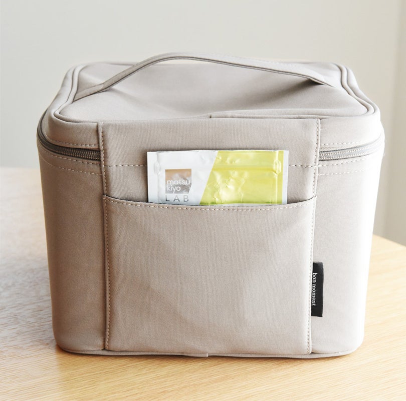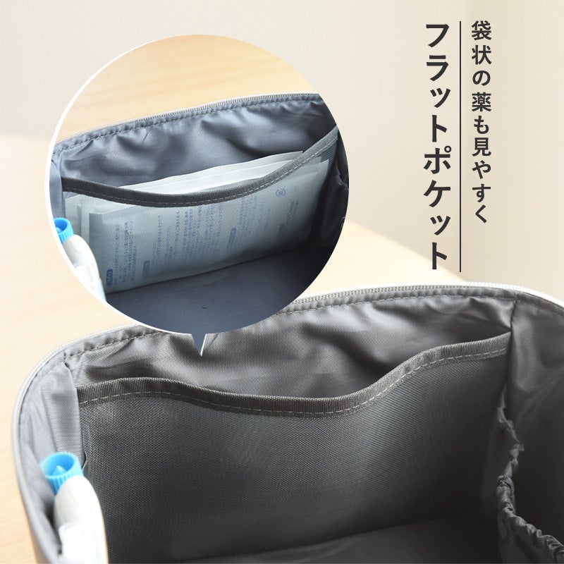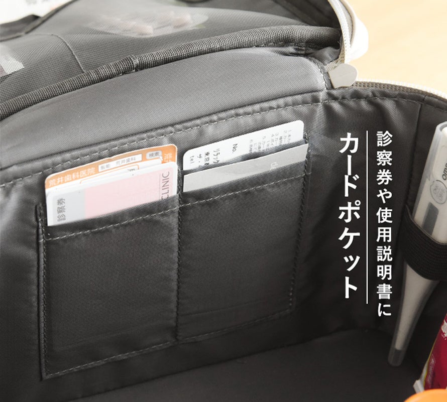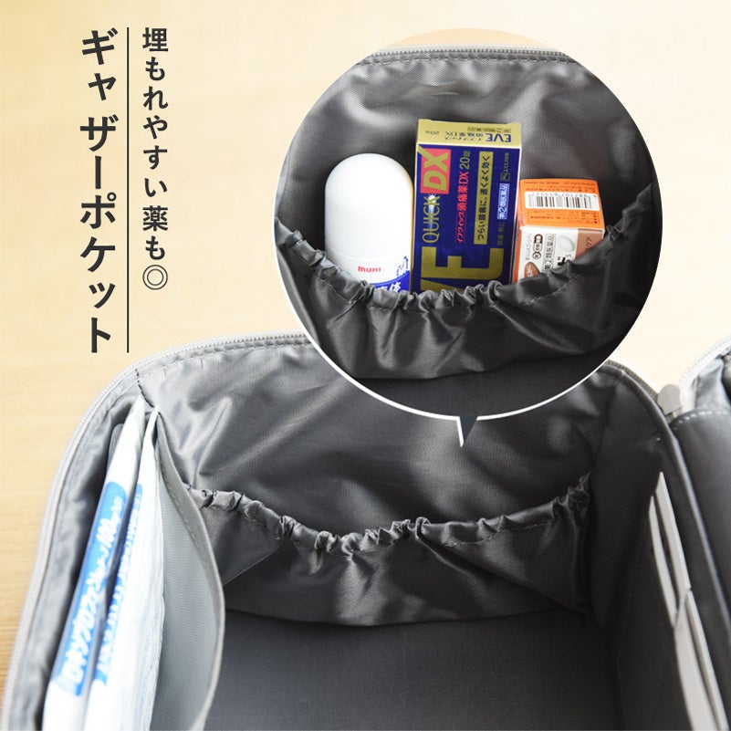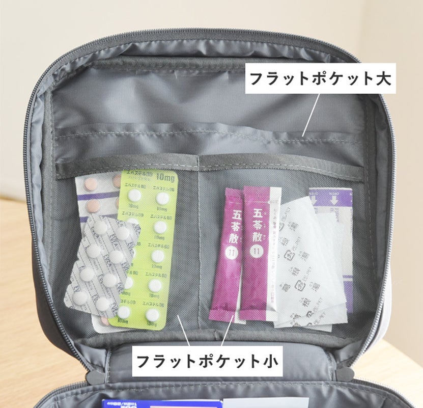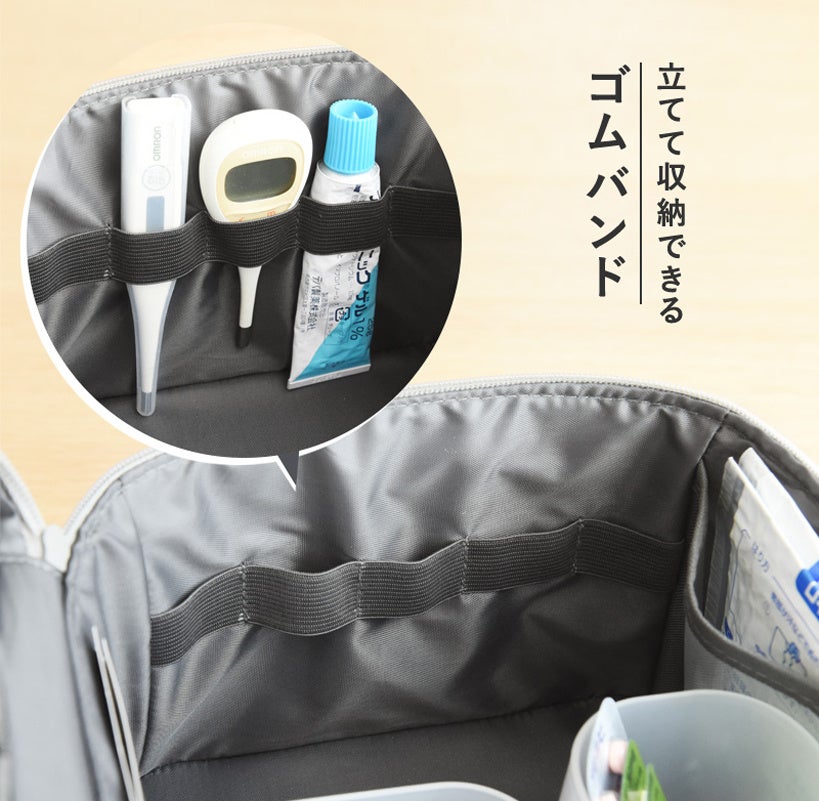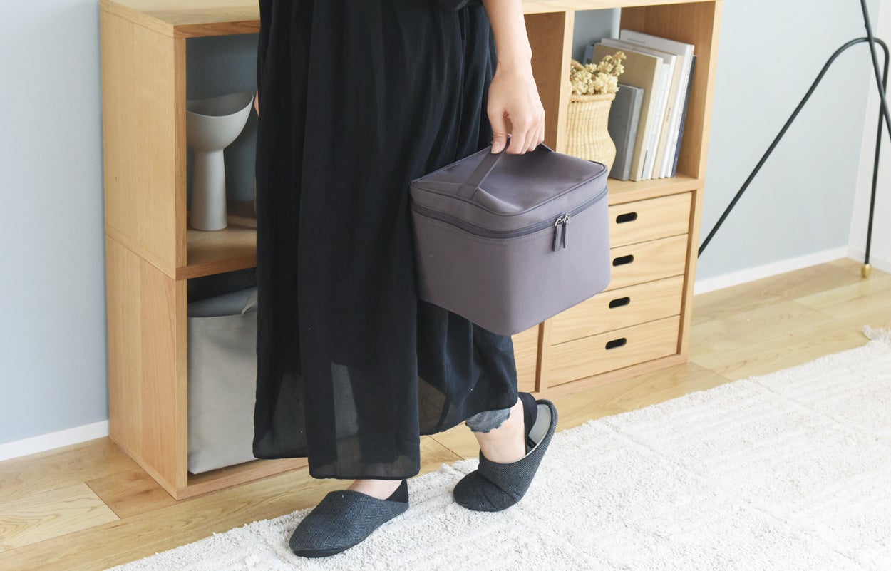 本体の素材はマットな微光沢素材のファブリック。まるでバニティポーチのような、一見救急箱には見えないデザインで、景観を崩さず置けるのがポイントです。