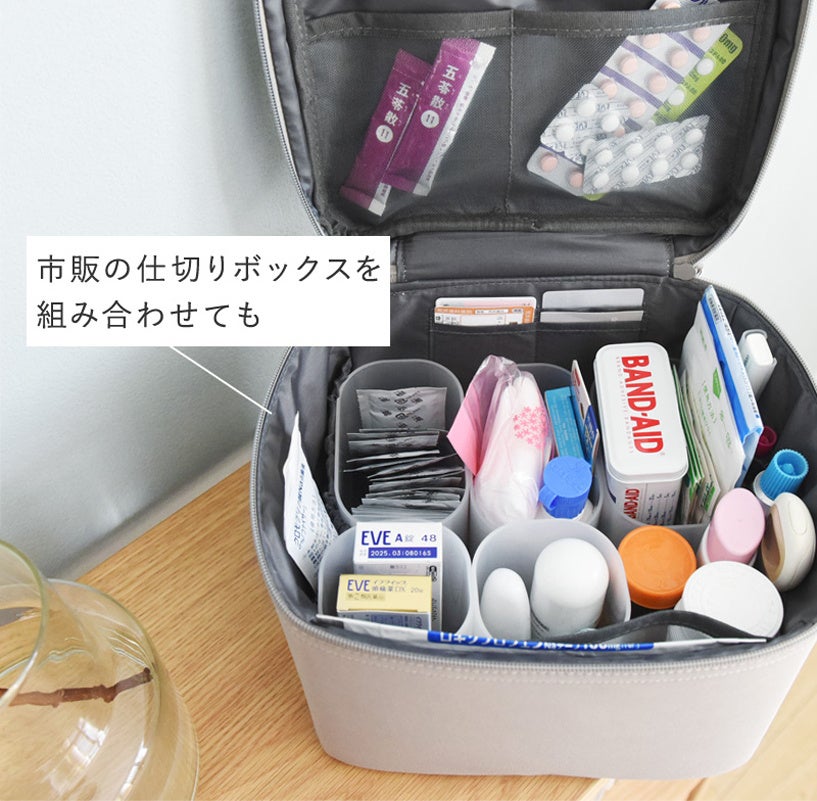 薬を箱ごと収納したり、市販の仕切りボックスをお好みで組合せたり、自由な使い方が可能に。