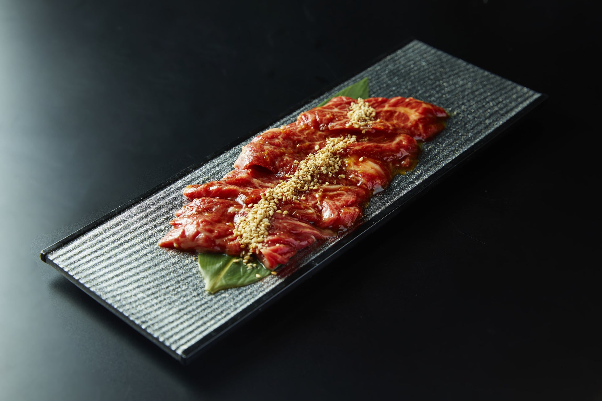 近江牛のバラ肉の中でも、厳選した上モノ部位である、「カイノミ、フランク、インサイド、タテバラ」のみを使用。秘伝の揉みダレを組み合わせることで、とてつもない旨味が出てくるのが特徴です。