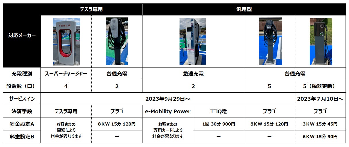 今般の充電設備の主な更新・増設内容としては、軽井沢町と「電気自動車充電インフラの整備等に関する協定」を締結している株式会社プラゴ社の普通充電設備5口を更新したこと、また、電気自動車世界シェアNO.1の米テスラ社製の専用充電器を新たに6口設置したことです。そのうち、米テスラ社製の専用充電器4口は急速で充電が可能な「スーパーチャージャー」で、当該充電設備は軽井沢町内においては初の設置です。