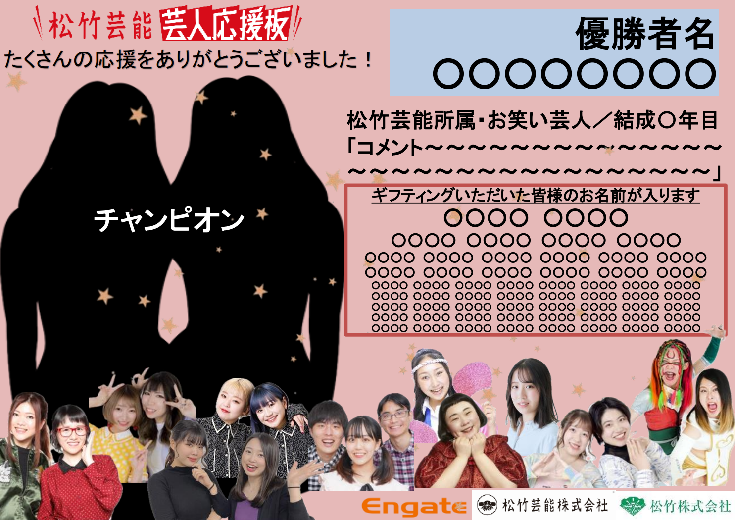 松竹株式会社(住所:東京都中央区、代表取締役社長:髙𣘺 敏弘)と松竹芸能株式会社(住所:大阪市中央区、代表取締役社長:関根 康)は、スポーツ応援プラットフォーム「エンゲート」を運営するエンゲート株式会社(住所:東京都中央区、代表取締役:城⼾ 幸⼀郎)とともに、お笑い芸人へギフティングができる応援プラットフォーム「松竹芸能 芸人応援板」(URL:https://geinin-oenban.shochikugeino.jp/communities/shochikugeino/)にて、応援広告イベントを実施いたします。