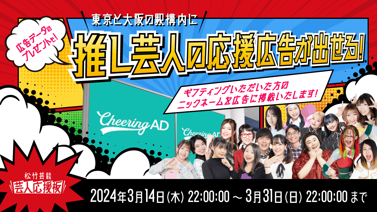 ギフティングプラットフォーム「松竹芸能 芸人応援板」にて応援広告企画を実施!目標金額を達成して、東京と大阪の駅構内に「 推しの芸人の応援広告 」を掲載しよう!