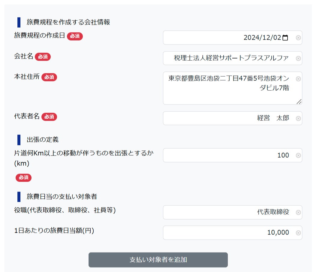 出張旅費規程は、オンラインテンプレートへ情報を入力していくことで作成できます。