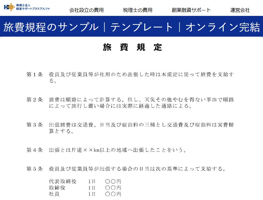 「旅費規程のサンプル|テンプレート|オンライン完結」ツール:https://keiei-support-plus-a.com/zeirishi-hiyou/ryohikitei-sample-template/
