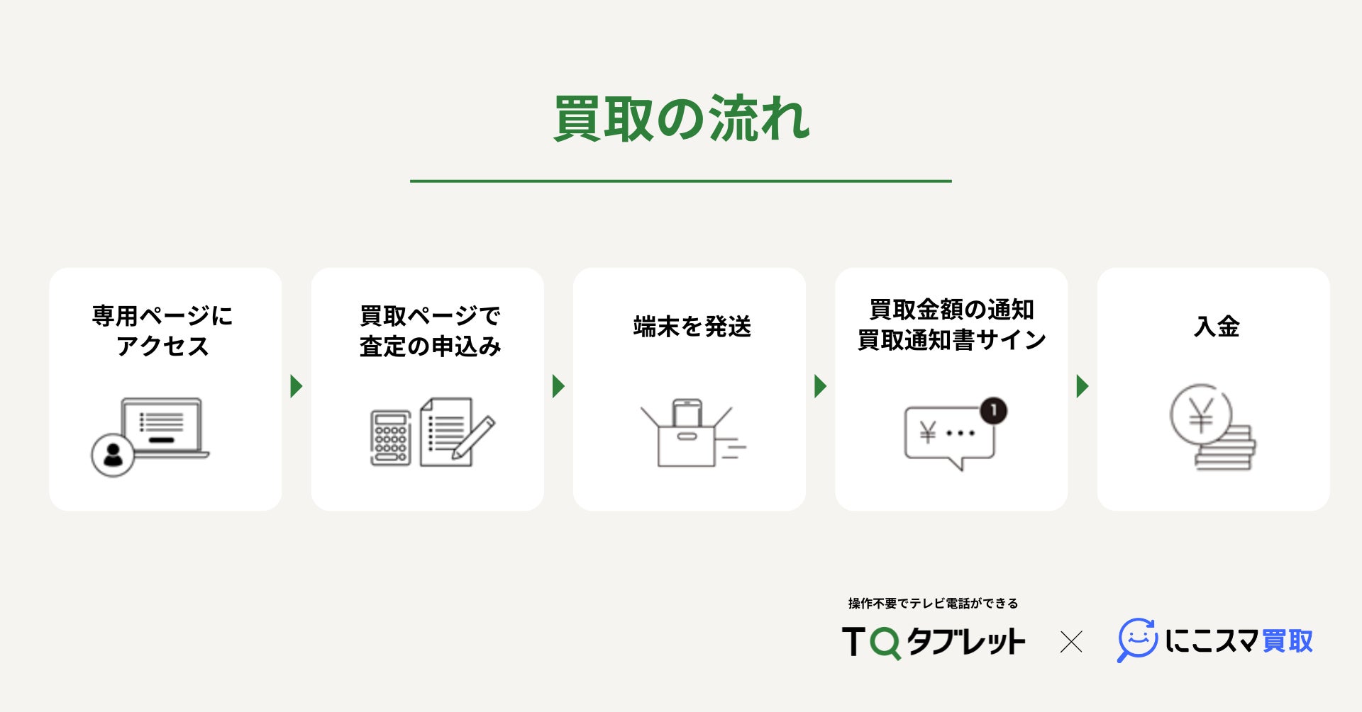 「TQタブレット」をご利用中・ご検討中のお客さまを対象に、ご家庭で不要となったスマートフォン・タブレットを、「にこスマ買取」(※)にて買い取りを行うサービスです。その買取金額を「TQタブレット」の購入費用や利用料にご活用いただくなど、新しいコミュニケーション手段を選択する一助としていただくことを目的としています。買い取りを希望するお客さまは、TQタブレットの専用WEBページから「にこスマ買取」への査定をお申し込みいただけます。