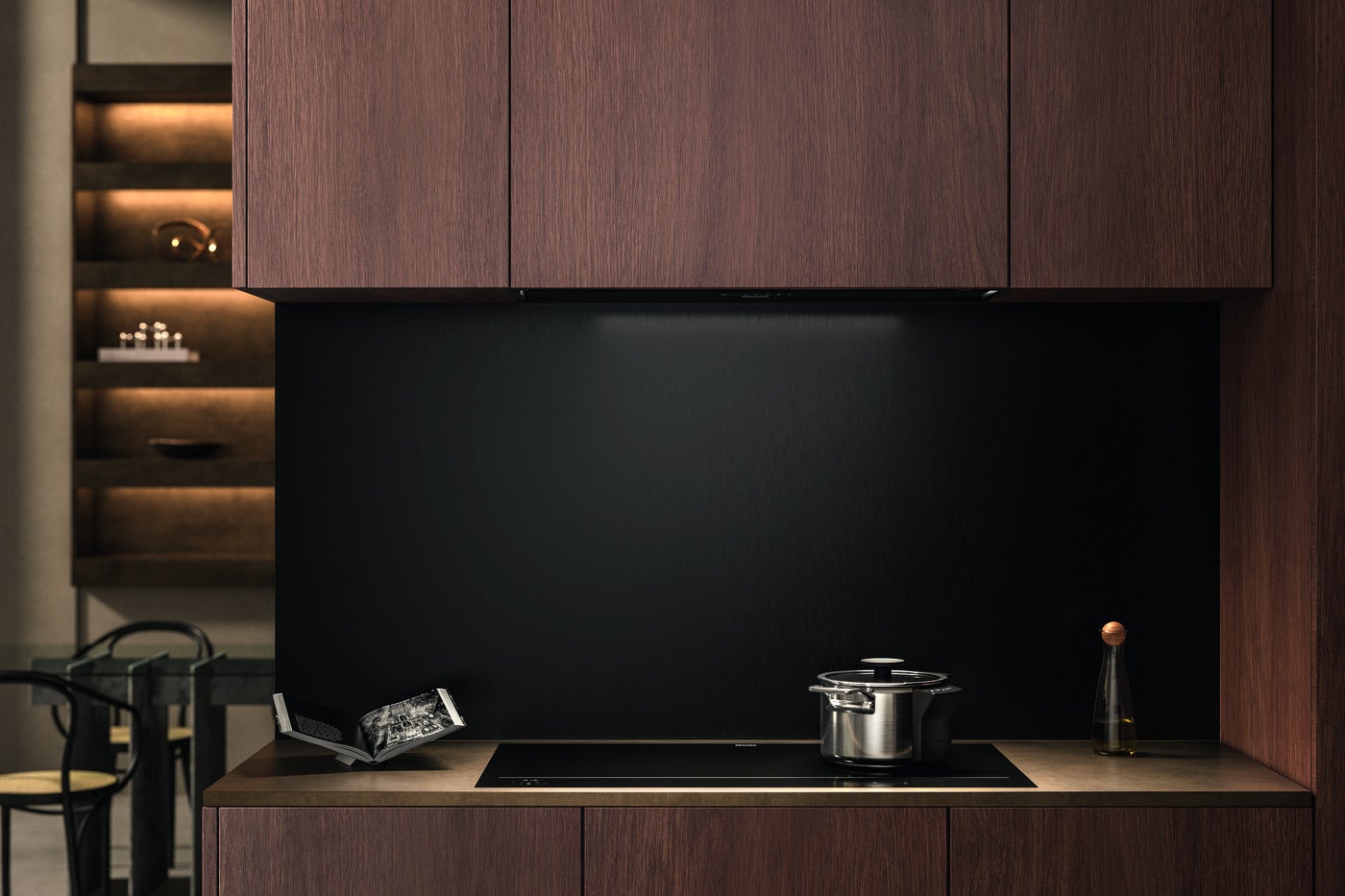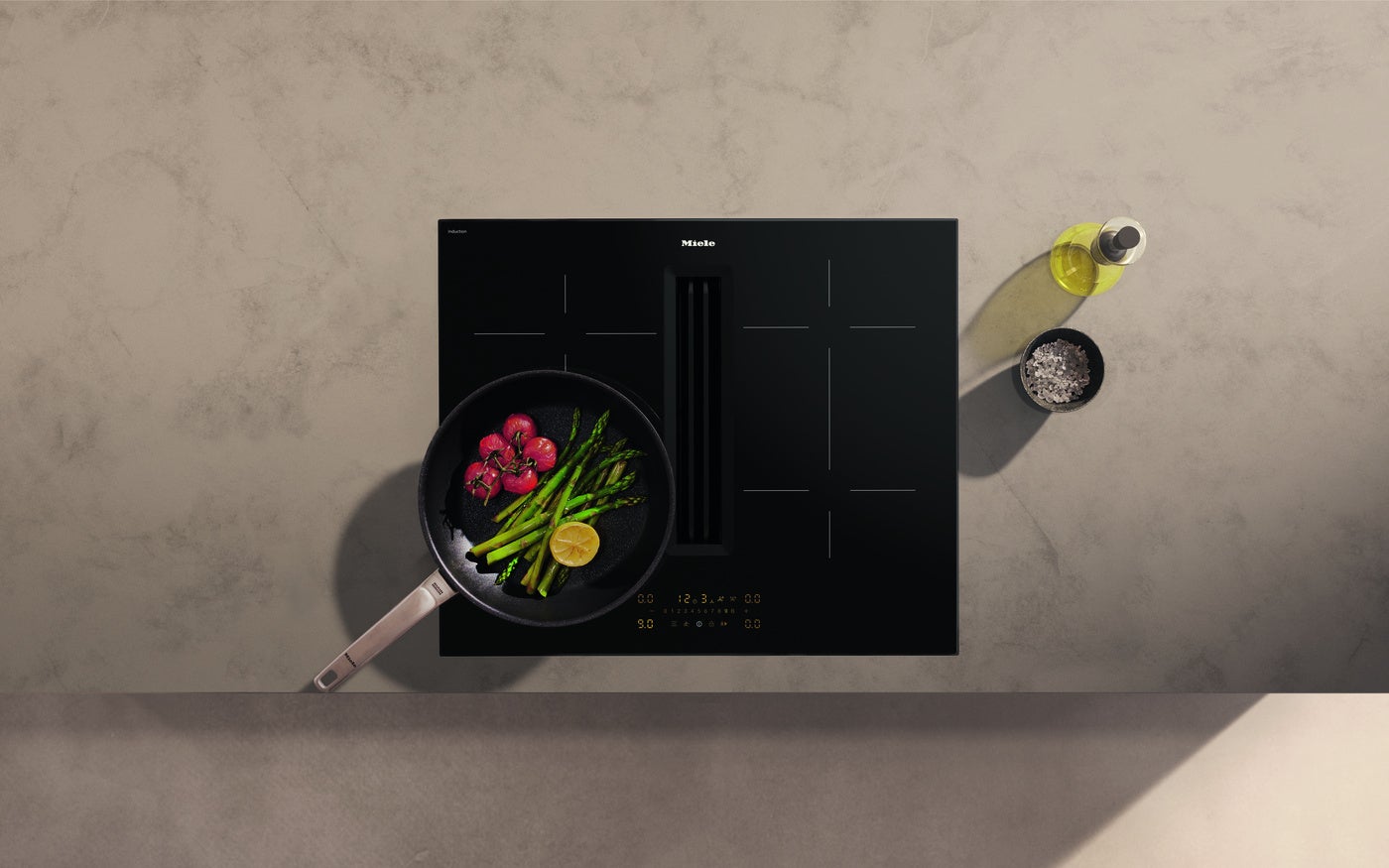 photo 5: 一体型換気システムを備えた60cm幅のKMDA 5649クッキングヒーターは、調理中に発生する蒸気を調理面から直接吸引することで、別途レンジフードを設置する必要がありません。これにより、視界を遮る要素のない、落ち着きと開放感のあるキッチンデザインを実現します。(photo:Miele)