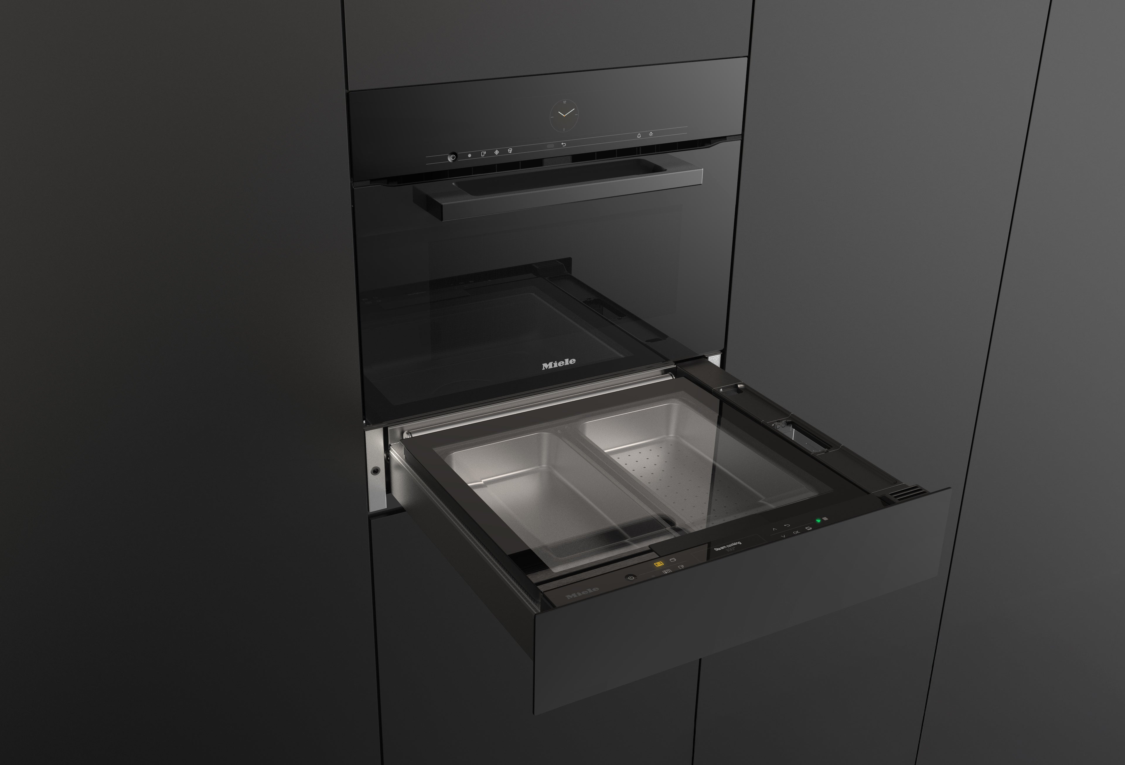 photo 3: 新しいMieleのスチームドロワーは、高さ60cmのスペースに、高さ45cmの電子レンジ機能付オーブンと組み合わせることで、ベーキング、あたため、スチーム調理をこなす省スペースの3in-1ソリューションを実現。2つの独立したスチーム調理用コンテナを備え、異なる食材を同時に調理することが可能です。ドイツでは2027年3月発売予定。 (photo: Miele)
