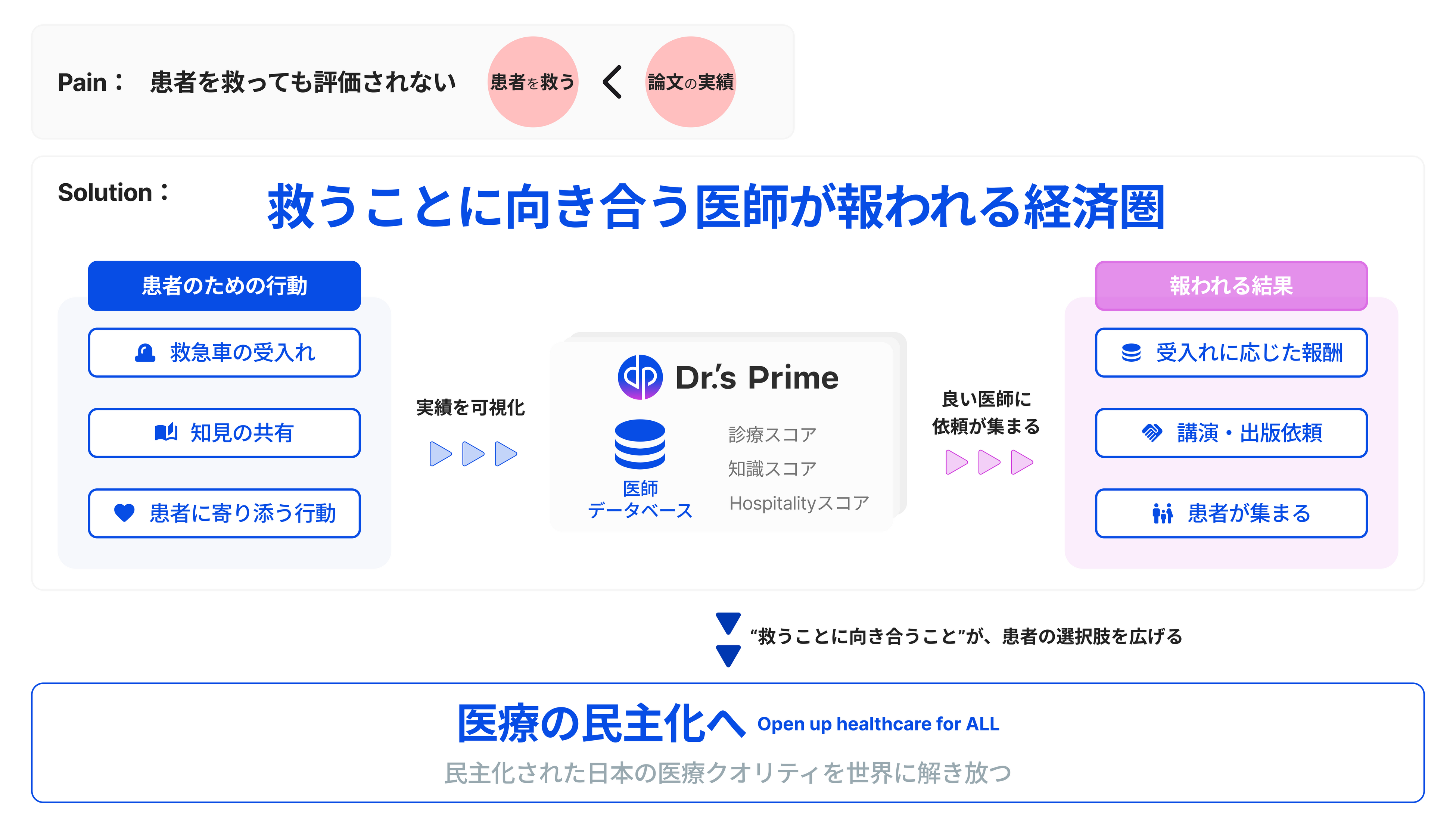 この課題を解決するため、"Open up healthcare for all" の想いを胸に、救うことに向き合う医師が報われる仕組みをつくり、患者さんにとって本当に良い医療が提供される世界を作っていきます。この受賞を励みに、チーム一同これからも頑張って参ります!