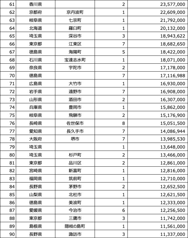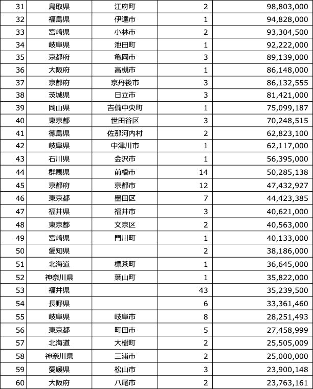 泉佐野市が一位となりました。プロジェクト数17、寄付額は34億円です。泉佐野市はふるさと納税3.0を推進しています。泉佐野市ホームページより説明を抜粋します。(寄附者のみなさんの応援によるクラウドファンディングを活用し返礼品をご提供いただく企業や個人事業主が泉佐野市内で行う地場産品の開発や地場産品の磨き上げに向けた取り組みを支援することで、魅力的な地場産品を充実させ、寄附者のみなさんに返礼品としてお届けするという、新しいふるさと納税のカタチです。)