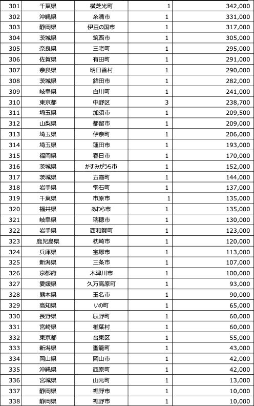 このようにクラウドファンディングは、感情がゆさぶられるような、国民の共感が得られやすいプロジェクトが成功する可能性が高くなっています。返礼品が主役となる通常のふるさと納税事業と比較すると、効率的はありませんが、寄付の本来の姿であることは確かです。クラウドファンディングに挑戦された以下の338の自治体は、金額の多寡にかかわらず評価されるべきですし、昨年度クラウドファンディングに取り組まれていない1,000以上の自治体は今年度、ぜひ取り組んでいただきたいと思います。