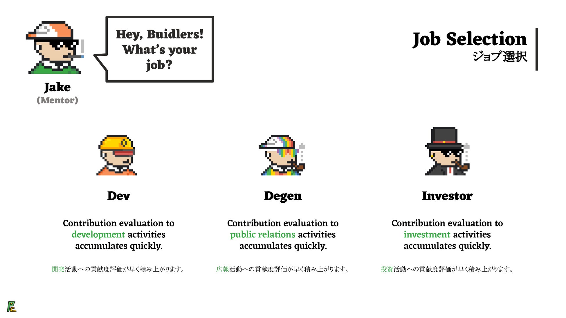 "Epics - The Buidlers Guild"のプレイヤーは、まず最初に"Dev(開発者)", "Degen(広報)", "Investor(投資家)"どのジョブで参加するかを決定します。どのプレイヤーも開発・広報・投資すべての活動が可能ですが、ジョブによって行動の結果得るポイントの量が変わります。オープンソース開発において自分の得意なポジションを選ぶことで、ゲームにおいても最高の結果を得ることができます。