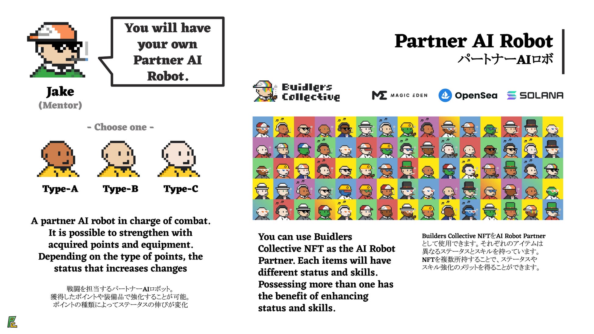 デフォルトの AI ロボに装備をつけて戦うこともできますが、Buidlers Collective NFT は最初からレア装備がついていたり、レベル制限が高くより強く成長する AI ロボとしてゲーム上で利用できます。