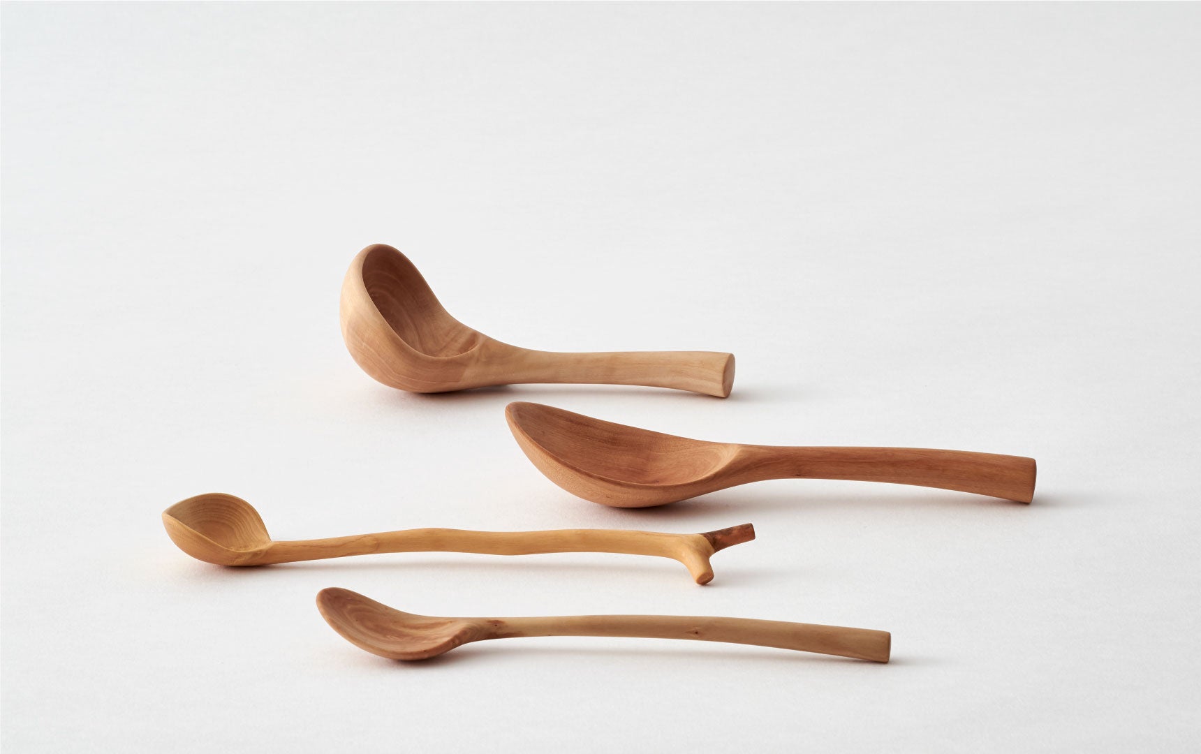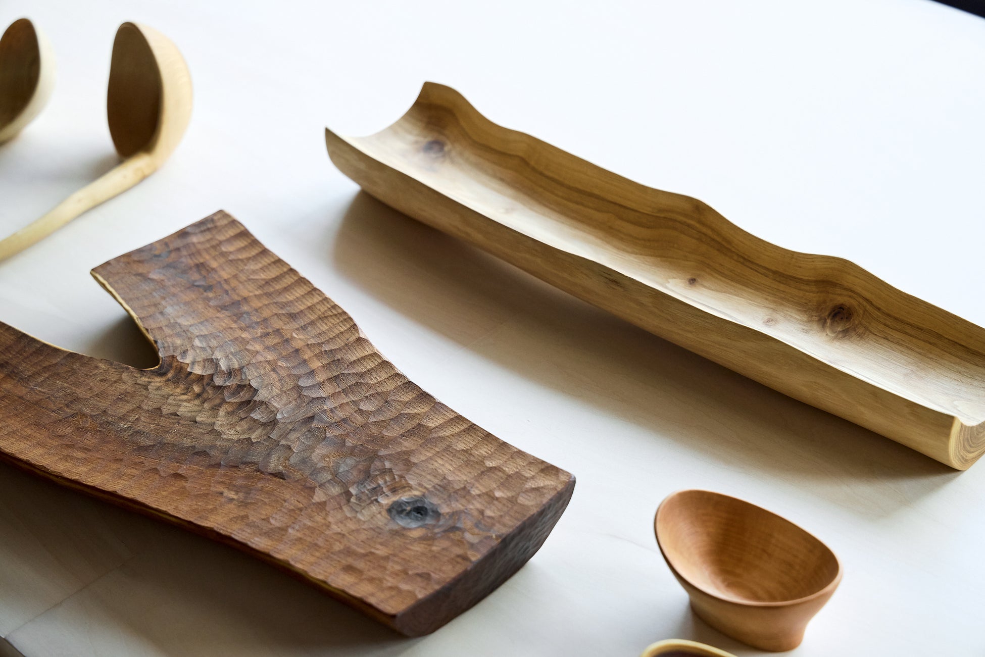 作家が粗削りした枝のスプーンから好きな形や材料を選び、紙やすりとオイルを使用し磨いて完成させます。木の自然な形を活かした世界にひとつだけのスプーンを作ることができます。