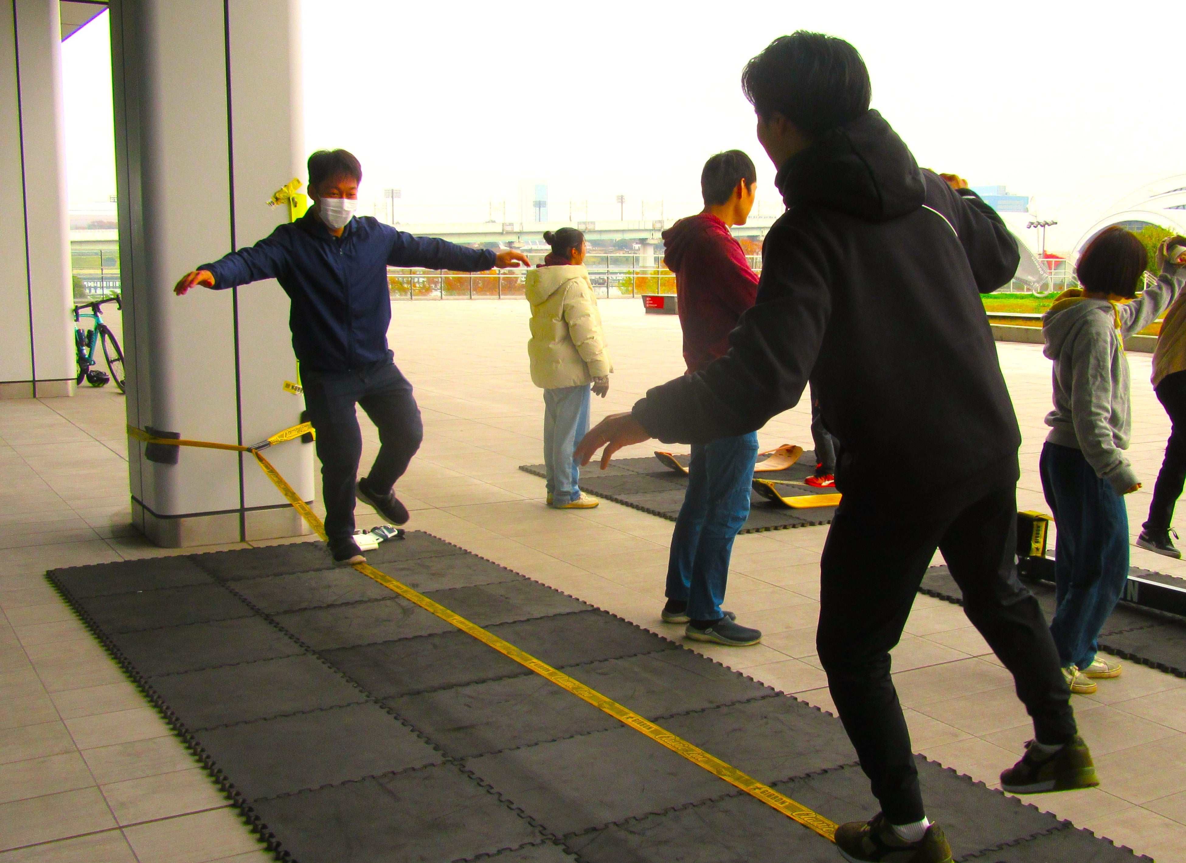 立ち上がるのが難しい場合でも、スラックラインに座って体感していただくことで、楽しんでいただけます。