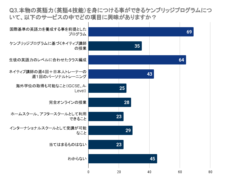 Q3で「本物の英語力(英語4技能)を身につける事ができるケンブリッジプログラムについて、以下のサービスの中でどの項目に興味がありますか?(複数回答可)」と質問したところ、宮城県で最も多かったのは「国際基準の英語力を養成する事を前提としたプログラム」で69名でした。次いで、「生徒の英語力のレベルに合わせたクラス編成」には64名、「ネイティブ講師の週4回+日本人トレーナーの週1回のパーソナルトレーニング」には43名が興味を持っています。一方で、「海外学位の取得も可能なこと(IGCSE、A-Level)」や「ホームスクール、アフタースクールとして利用できること」に関心を持つ人はやや少なめで、それぞれ25名、23名の回答でした。これらの結果から、多くの人は実用的な英語力の養成や個別のニーズに応じた指導に重きを置いていることが伺えます。
