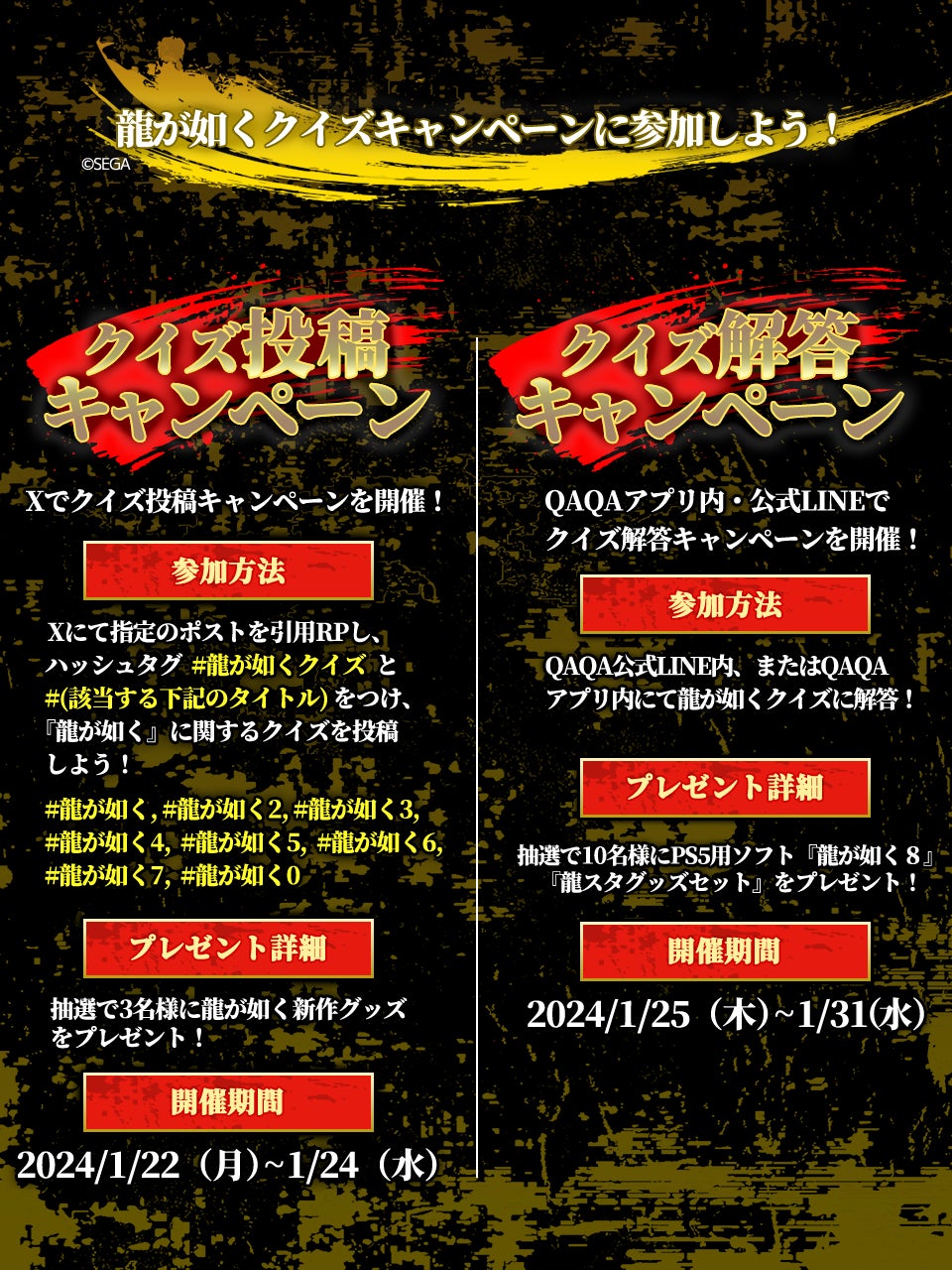 『龍が如く8』の発売を記念して実施する本キャンペーンでは、X(旧Twitter)で『龍が如く』シリーズに関するクイズ投稿を募集する「クイズ投稿」と、投稿されたクイズに解答する「クイズ解答」の2つのキャンペーンを実施します。また、1月25日(木)に予定されている「龍が如くスタジオ」の生配信番組「龍スタTV」内でも紹介予定です。