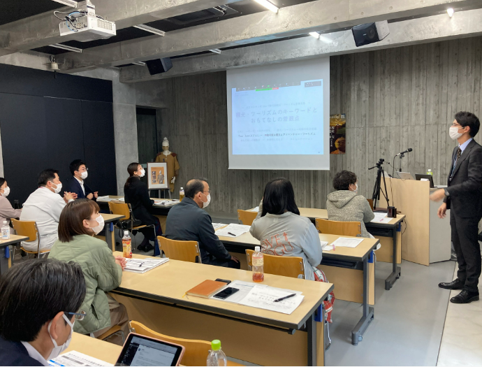 後半は、「接客応対」「コミュニケーション」「外国語の基礎」等、施設案内や観光案内の場面で役立つおもてなしの知識や心構えに関する講義が行われました。