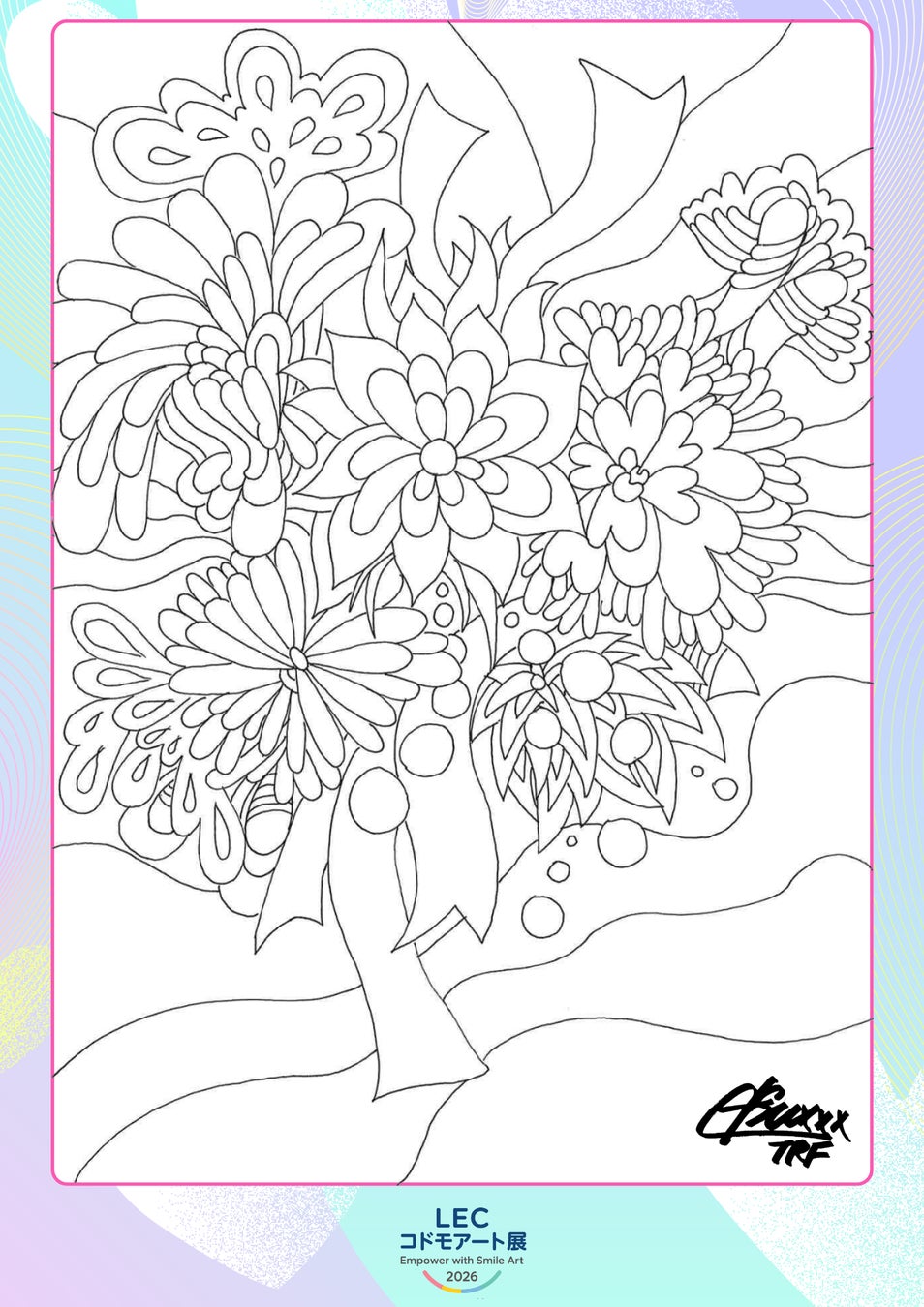 TRFのメンバーとして多くの人に笑顔と希望を届けてきた ETSU さんが、 本プロジェクトのために特別な線画アートを描き下ろしました。線画は、全国の子どもたちがその線画に“未来の色”を自由に重ね、 一枚のぬり絵を通して“希望のパレット”を完成させる、参加型のアート体験です。