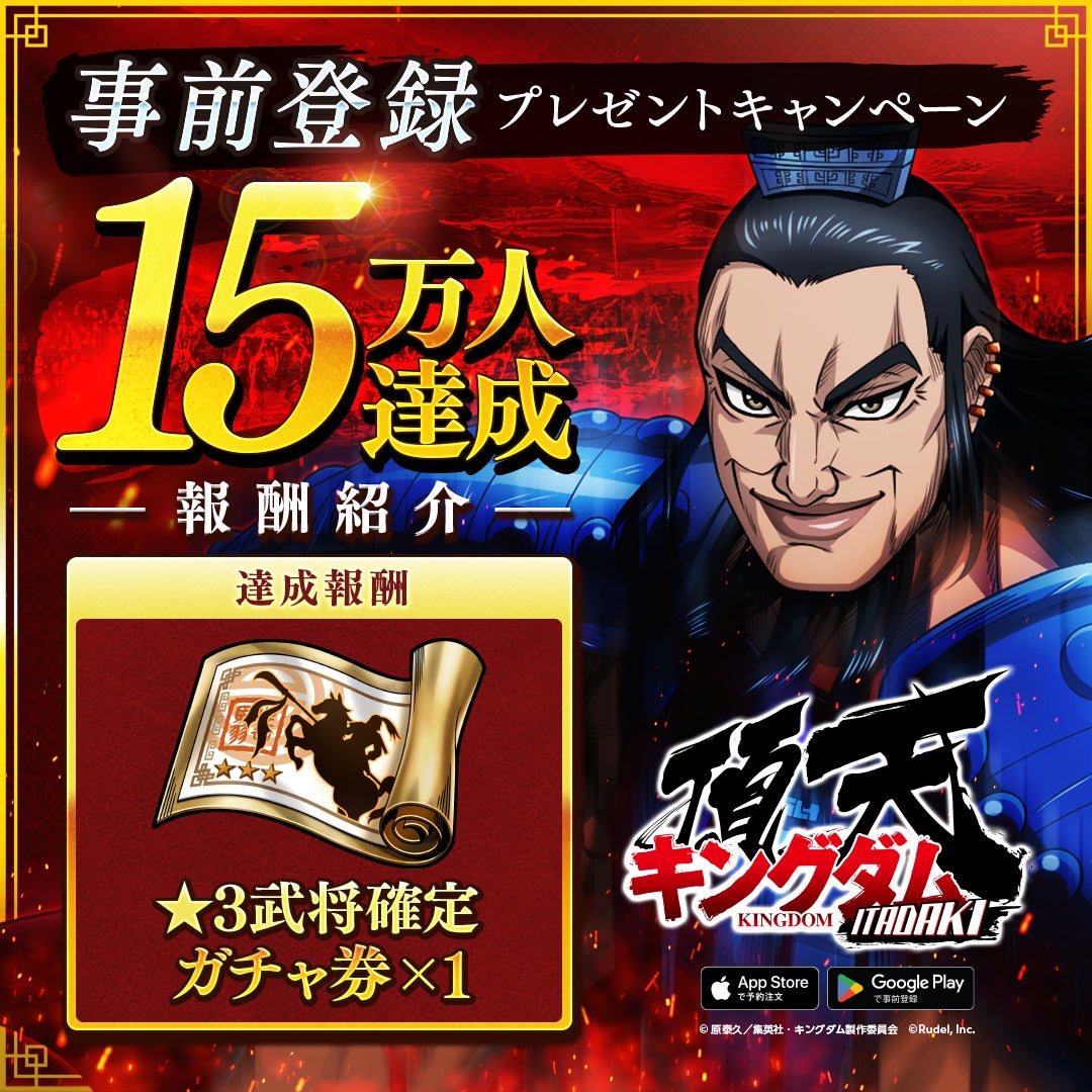 『キングダム 頂天』の事前登録者が12万人を突破いたしましたので、リリース後に金6,000個、【事前登録専用】ガチャ券(11連ガチャチケット)2枚、そして★3 河了貂 1体を皆様にプレゼントいたします。誠にありがとうございます!