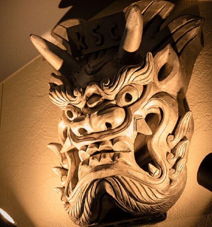 ▲「鬼サウナ」のシンボルとなる菊間瓦の鬼瓦【菊間町】
