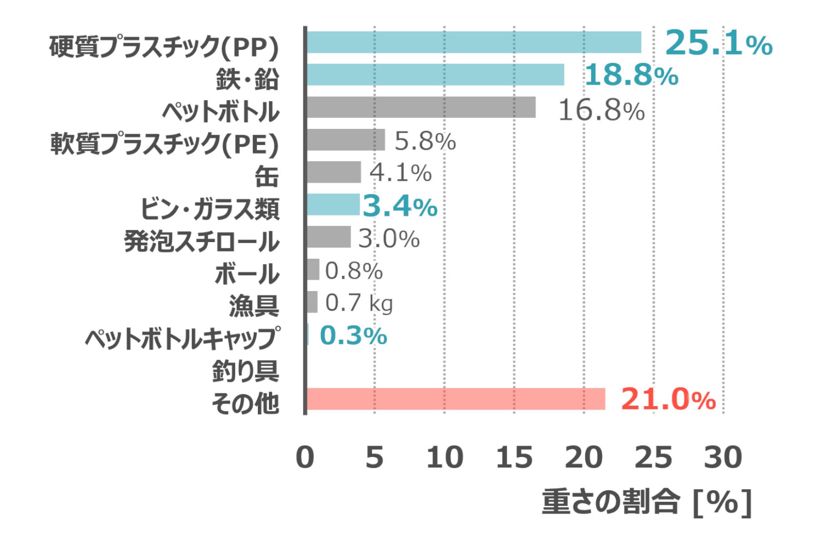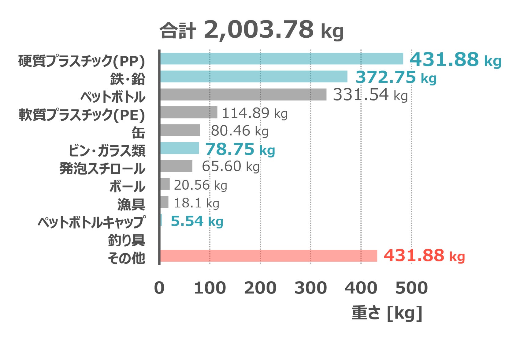 回収された海洋ごみの総量は2,003.78kgに達しました。中でも、重量ベースで最も多かったのは硬質プラスチックで、全体の約1/4を占めています。