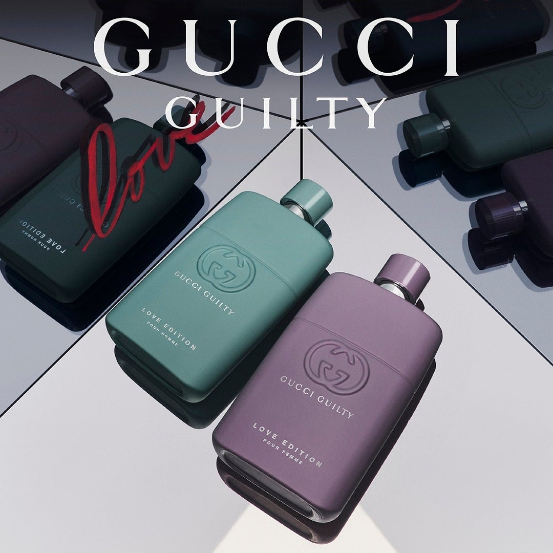 グッチ ギルティ ラブ エディションは、一連の魅力的なビジュアルで紹介されます。この広告ビジュアルでは、新しいフレグランスを主役に、2本のボトルを並べたり、グッチ ギルティ コレクションの他のフレグランスと組み合わせたりした構図で、愛の多面的な魅力を象徴的に表現しています。