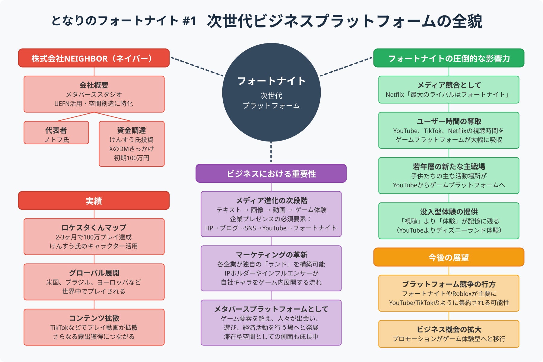 株式会社NEIGHBOR(本社:東京都千代田区、代表取締役CEO:ノトフ、以下NEIGHBOR)は、世界で4億人以上のユーザーを誇るゲーム「フォートナイト」について、ビジネスパーソン向けビデオポッドキャスト「となりのフォートナイト」と連動noteでの情報発信をスタートします。フォートナイトの歴史から、国内外でのフォートナイトを活用したマーケティング事例まで、ビジネス活用の視点から幅広く解説していきます。