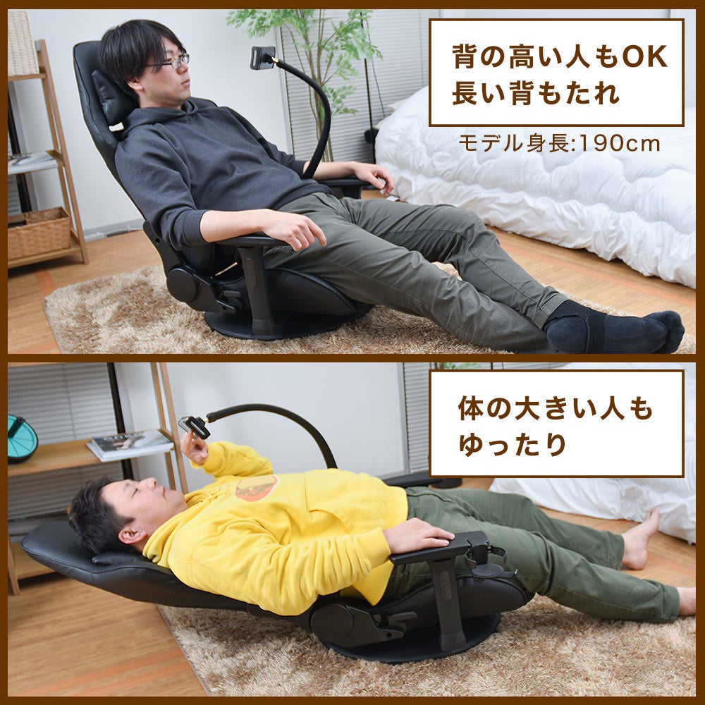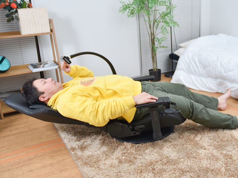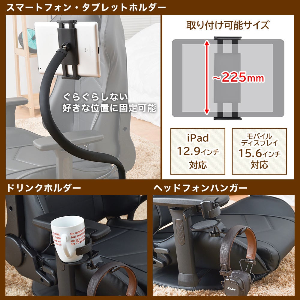 座面左側にはフレキシブルアームの自由な位置で使えるスマホタブレットホルダーを完備。さらにドリンクホルダー、ヘッドホンホルダー付き。ひじ掛け、枕、腰当付で1日中快適に過ごせます。