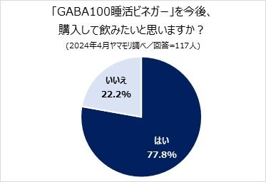 今回の調査では「GABA100睡活ビネガー」の飲用を1週間以上続けていただき感想をお伺いしました。まず、今後の購入意向を確認したところ、継続して購入したいと答えた方は全体の77.8%となりました。