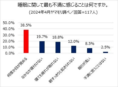 今回の調査で、睡眠に「不満がある」「時々不満がある」と答えた方は91.5%に及びました。日々の睡眠に満足をしている方は1割を下回る状況です。睡眠に関して最も不満を感じることについては、「何度か目が覚める」と答える方が多く、全体の38.5%を占めます。「なかなか寝付けない」「寝ても疲れが取れない」ことを不満点と感じている方はそれぞれ約20%となっています。