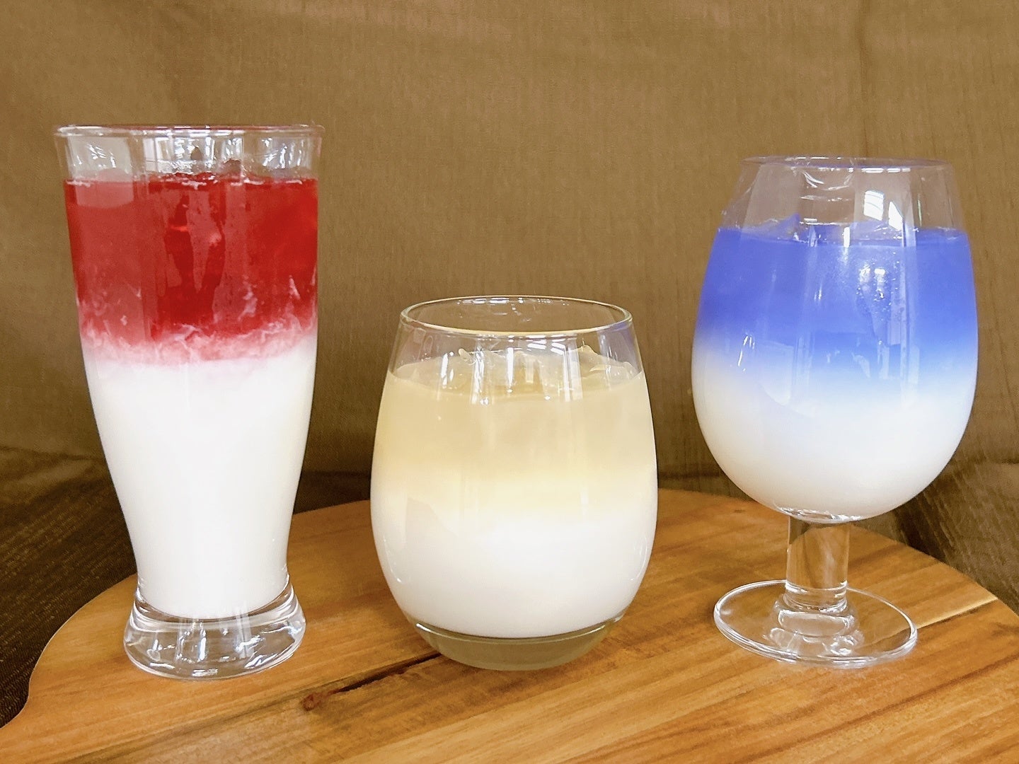 本品30ml+牛乳90mlで希釈し、氷を浮かべてお好みのハーブティーを静かに注ぎます。