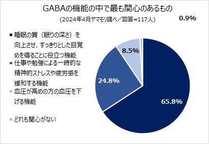 これらのGABAの機能の中で最も関心がある機能を聞いたところ、結果は「睡眠の質の向上(65.8%)」が1位となりました。