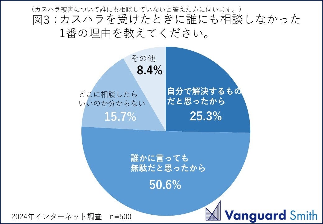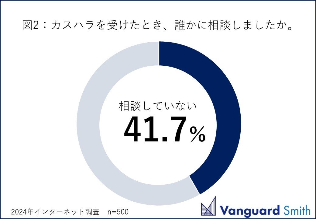 近頃、各メディアでもたびたび取り上げられ、2024年5月には東京都が「カスハラ防止条例」の制定に向けて具体的な動きをとるなど社会的にも“カスハラ”を問題視する傾向が見られています。さらに、誰かに言っても無駄だと思っていることを理由に、誰にも相談しない人が4割以上(41.7%)いることも明らかになりました。こうした結果から、カスハラ被害について誰かに相談したところで、ストレス軽減や問題の解決には至らないと考える人が多いことが考えられます。