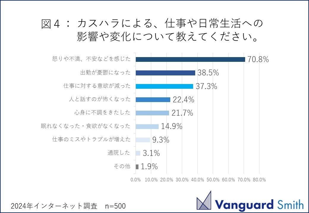 カスハラは心身への悪影響はもちろんのこと「仕事」のパフォーマンスに与える影響が圧倒的に大きいことが分かります。心身の不調が退職や転職につながることもじゅうぶんあり得るため、カスハラの被害はキャリアに直接つながっていると考えられます。