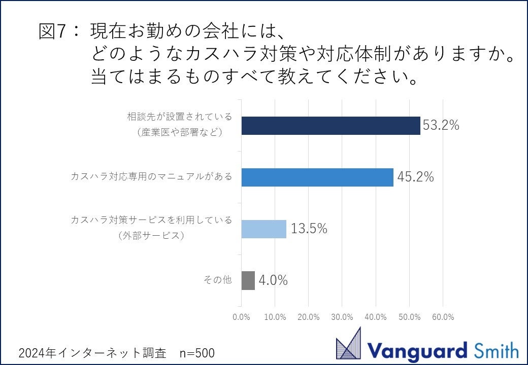 現在勤めている会社では、どのようなカスハラ対策を行っているかを訊くと【相談先が設置されている】が53.2%、【カスハラ対応専用のマニュアルがある】が45.2%という結果になりました(図7)。
