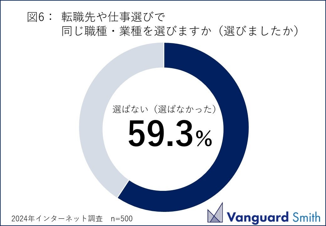 カスハラの被害が仕事や日常生活へ与えた影響や変化について聞くと【出勤が憂鬱になった】(38.5%)【仕事に対する意欲が減った】(37.3%)が高い割合を示しています(図4)。退職や転職理由の1つになったことがあるかを聞くと、半数以上(59.3%)が【ない】と答えた一方で、【ある】(15.1%)【転職や退職をしていないが検討したことがある】(25.6%)と回答した人は、合計で約4割(40.7%)という結果になりました(図5)。カスハラを受けてからの転職先や仕事選びで同じ職種・業界を選ぶかどうかの問いには約6割の人が【選ばない】(59.3%)と回答しました(図6)。