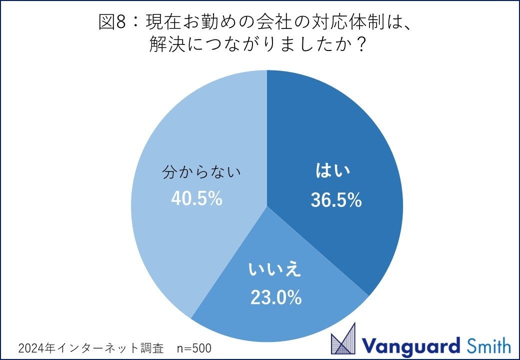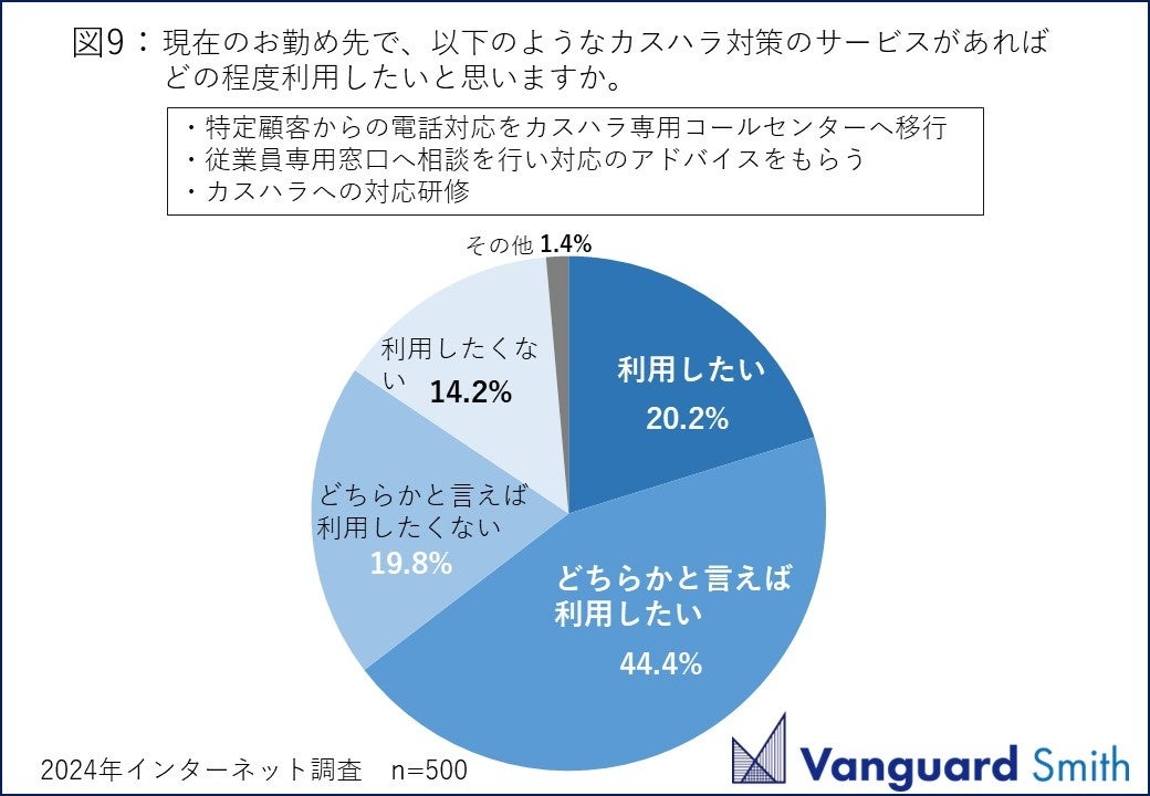 勤め先の対応体制がカスハラの解決につながっているかと聞くと【はい】が36.5%にとどまり、【いいえ】【分からない】の合計が63.5%になりました(図8)。カスハラ対策サービスがあればどの程度利用したいかという問いには【利用したい】(20.2%)【どちらかと言えば利用したい】(44.4%)の合計が6割を超える(64.6%)結果になりました(図9)。